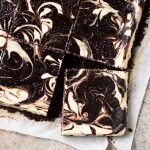 - Pour 2/3 of the mixture into prepared pan, followed by the cheesecake layer. Add the remaining brownie batter in 4 dollops, and swirl the two batters together using a knife.