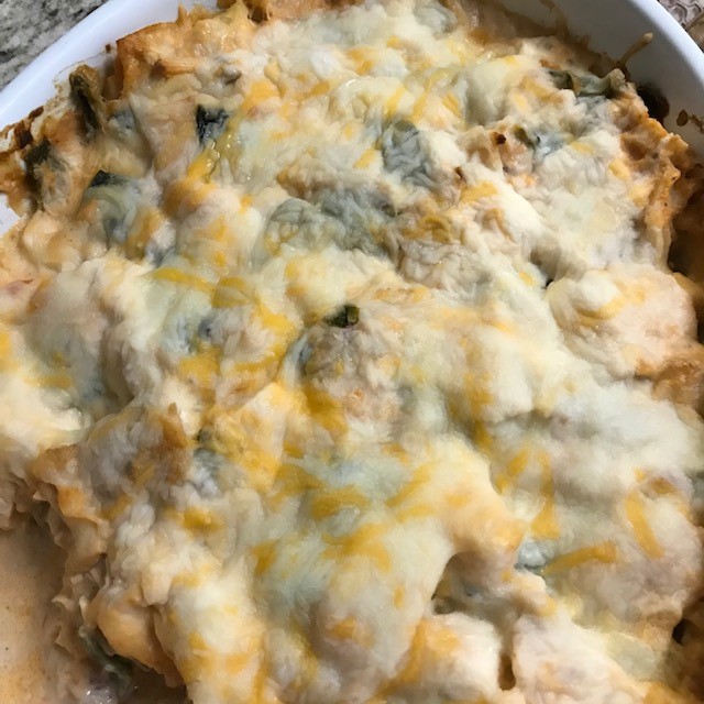 - Mix poblano peppers into the chicken mixture and gently mix. Spoon into a casserole dish and sprinkle on the reserved cheese.