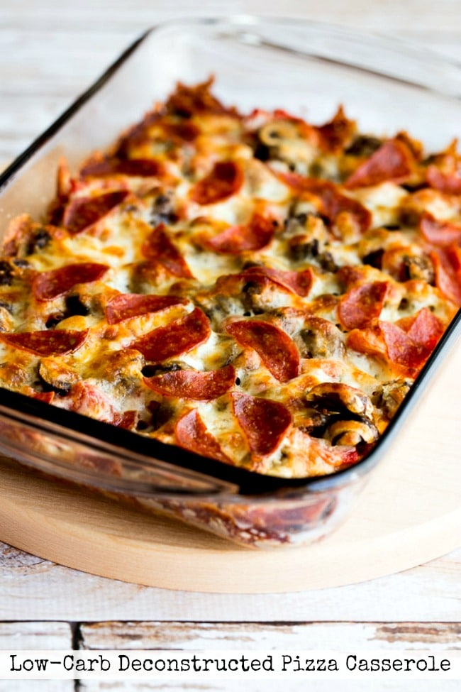 - Cut pepperoni in half. Sprinkle the grated Mozzarella over the top of the casserole and lay the pepperoni pieces on top of the cheese, spacing them evenly so the whole top is covered with pepperoni.
