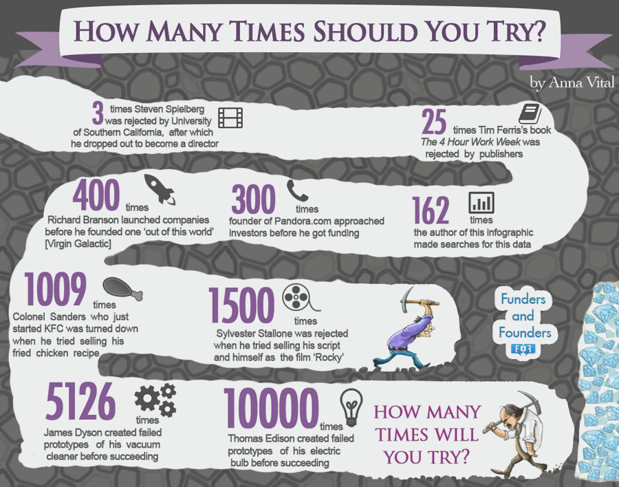 Have you ever tried to do something and the people that you love laugh at you or remind you of all the times you have failed in the past??!?!?!?!?!?! Remember Colonel Sanders of KFC? Remember Thomas Edison? Take a look at the chart below and see how many times different people tried something before they were successful.
