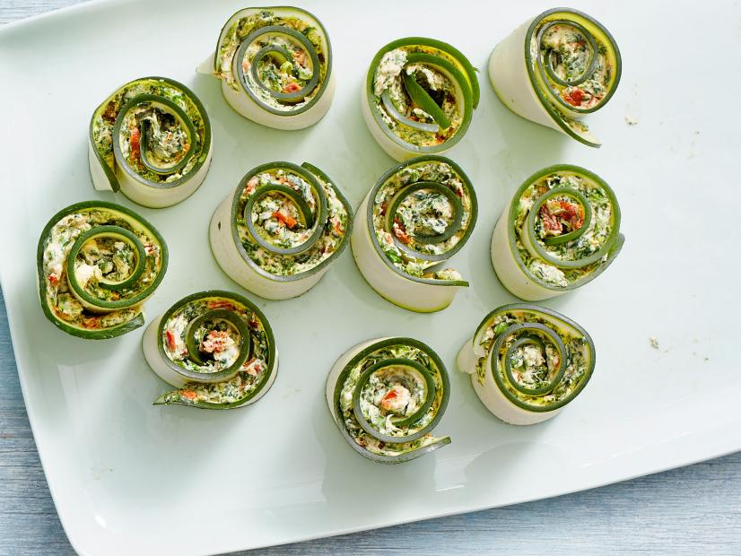 - To assemble the pinwheels, spread a heaping teaspoon of the cheese mixture on each zucchini slice. Starting at one end, roll the zucchini toward the other end. Place the pinwheels upright on a serving tray.